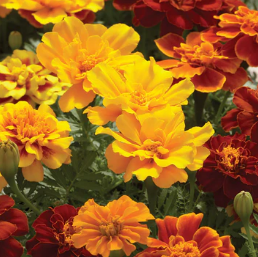 The Tropical Twist If you want a marigold that feels like a vacation, this is the one. It features stunning, bi-color blooms with a mix of zesty orange and deep mahogany-red that really does look like a ripe mango. It stays nice and compact, but the flowers are surprisingly large and “puffy” (anemone-style). It’s a great way to add a bit of exotic, tropical energy to your garden without any extra work. Amazing petal contrast, great for solo planting.